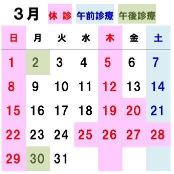 | 診療時間 | 午前:8:45~12:00 午後:15:30~18:00 予防接種・健診:8:30~8:45、13:30~15:00 休診日:木曜、土曜午後、日曜、祝日 |