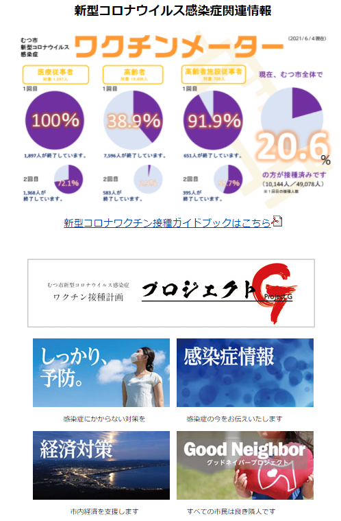ワクチン接種は、医療従事者、介護施設職員については、既にほぼ全員が1回目の接種を終了し(2回目も間もなく終了)、高齢者も医療機関個別と集団の組合せで半数近くが1回目の接種を終えました。