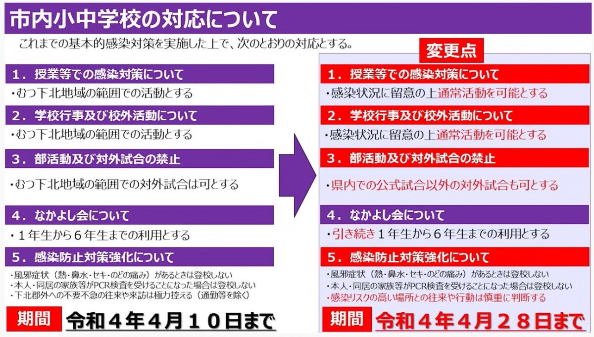 小中学校においては、下北地域に限定されていた学校活動の範囲や、下北地域以外との往来が制限無しとなりますが、全国的には大都市では足踏み、地方では再増加している状況で、決して感染リスクがなくなったわけではありません。