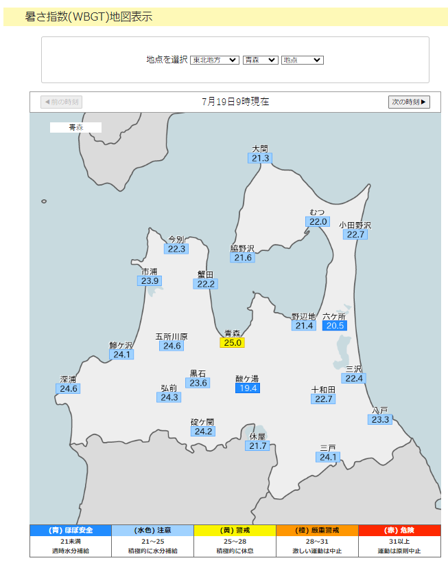気温30度以上の真夏日や35度以上の猛暑日は勿論のことですが、熱中症は高気温だけではなく高湿度でも起きやすくなる(汗をかきにくくなる)ので、環境省の熱中症予防情報サイトの「暑さ指数(WBGT)」が良い指標となります。