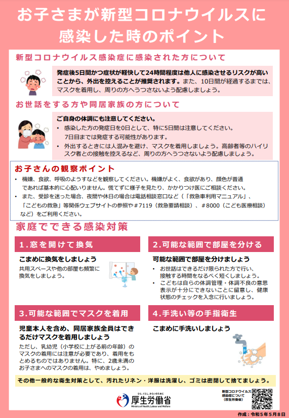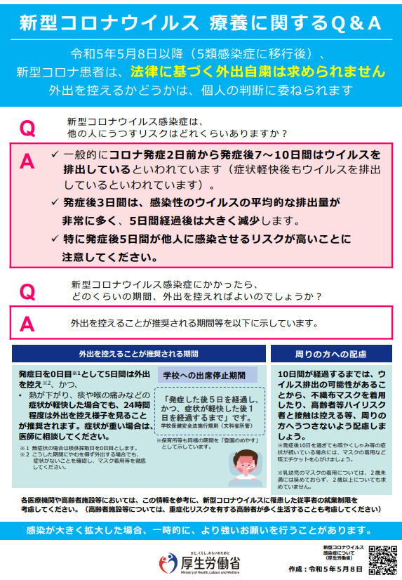 新型コロナに感染した場合の出校停止措置は「「発症した後5日を経過し、かつ、症状が軽快した後1日を経過するまで」となっていますが、これはウイルス排泄量が非常に多く、周囲への感染力が強い期間の話です。